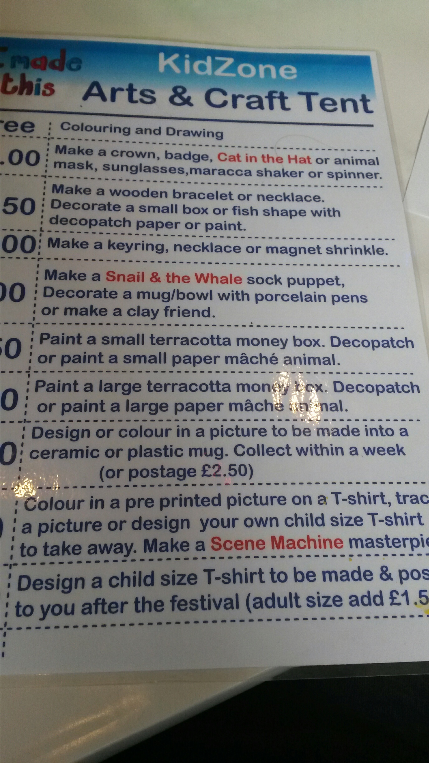 Then we headed along to check out the kidzone at the Pleasance, which was as great as always. We did some of the arts and crafts – you can see what’s on offer in the photo, and prices start at £1 which I think is fantastic value in the festival – it was busy and lots of little ones were enjoying being creative there !