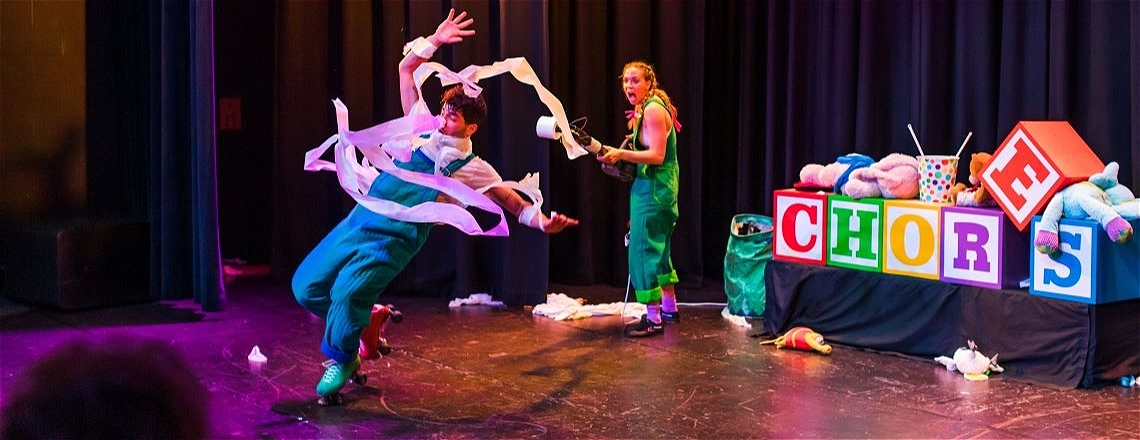 Chores -Chores is the story of a brother and sister who have to clean up their messy room so they can ride their bicycles. This show is jam-packed full of cool stunts, acrobatic flips, roller skates, juggling and the infamous toilet paper guns!